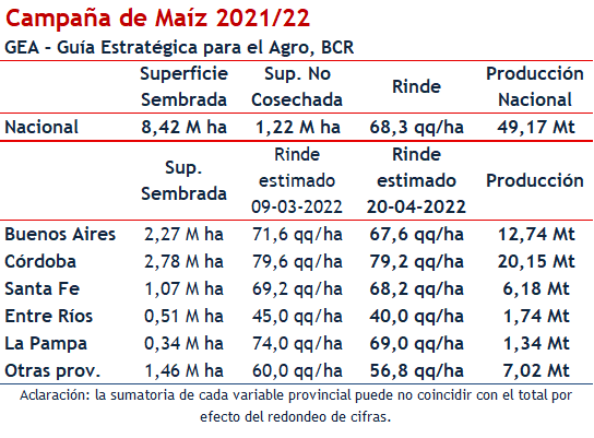 Se levantó poco más de la tercera parte, un 40%, y respecto al año pasado hay un adelanto de un 5%. En Córdoba van muy rápido este año, ya hay 40% de cosecha cuando no se llega a un 25% a esta altura del año pasado. ¿Pueden mejorar todavía los resultados en Argentina? Sí, pero habrá que esperar, los resultados siguen siendo muy erráticos. Las siembras tempranas en general siguen mostrando rindes que van a menos, pero hay maíces tardíos y zonas que empiezan a mejorar. Por ahora, se mantienen los guarismos de abril. Esto es un rinde nacional de 68,3 qq/ha, un área sembrada de 8,42 M ha (de las que 1,22 millón no entrarían al circuito comercial) y una producción de 49,17 millones de toneladas a escala nacional.