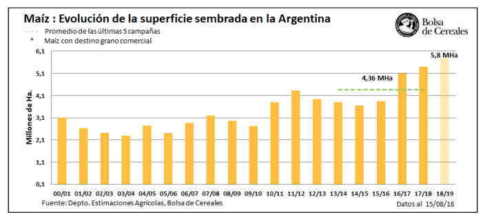 En este contexto, se espera un aumento del 7,4 % en la superficie destinada al cereal en comparación con el ciclo anterior, que en números absolutos permitirá implantar una superficie récord de 5,8 MHas de maíz con destino grano comercial a lo largo de todas las zonas PAS.