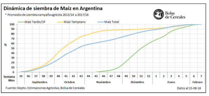 Bajo este escenario, se estima que el área destinada a maíz con destino grano comercial alcanzaría las 5.800.000 hectáreas para la campaña 2018/19. Dicha cifra se ubicaría un 7,4 % por encima del ciclo previo y un 33 % superior al promedio de las últimas cinco campañas agrícolas (Superficie 2013/14 a 2017/18: 4,36 M Has). En números absolutos, el incremento interanual representa unas 400.000 Ha, de las cuales un 44 % se concentra en la provincia de Córdoba y los Núcleos (Norte y Sur). Por otro lado, aún se continúa relevando la posible distribución entre planteos tempranos y tardíos y de segunda ocupación en cada región del país. Tanto la distribución de los cuadros, como la superficie final destinada al cereal de verano, estará supeditada a la evolución del tiempo durante la ventana de siembra que se extenderá desde principios de agosto hasta finales del mes de febrero a largo del área agrícola nacional.