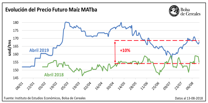 Los valores del maíz para la cosecha 2018/19 ofrecen una perspectiva positiva para el cierre de los márgenes. Si consideramos el futuro MATba a cosecha (abril ´19) como un indicador del valor del cereal para la campaña nueva, este se ubica un 10% por encima de la cotización registrada para esta posición en el período mayo – agosto de la campaña anterior.
