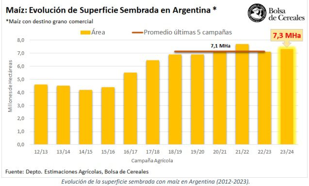 Por lo tanto, la intención es que la proporción temprano/tardío vuelva a valores normales, aunque sujeto a la disponibilidad hídrica durante los meses de septiembre y octubre. Las principales variables que tienen significancia a la hora de decidir sembrar maíz en este nuevo ciclo son: el nivel de reservas hídricas inicial de cara al comienzo de la ventana de siembra de los maíces tempranos, disponibilidad y precio de los insumos, superficie que ha dejado liberada el trigo y el girasol, un precio del cereal inferior a la campaña previa y la necesidad de sembrar para cubrir el bache que dejo el ciclo anterior. Frente a este panorama, se proyecta una superficie total destinada al maíz con destino grano comercial de 7.300.000 hectáreas para la nueva campaña, sujeta a la evolución de variables económicas y del tiempo (lluvias, temperaturas, etc.) durante la extensa ventana de siembra.