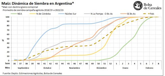 En el centro del área agrícola, por un lado, se menciona la incorporación de superficie de maíz debido a la baja en la superficie de cultivos de fina pero también juega un rol importante la competencia con la soja de primera debido al incremento de los costos de los insumos y una falta de financiamiento para la compra de estos. En el sur del área agrícola, la superficie que va a dejar liberada el girasol podría tener como destino la siembra de maíz, relegando, en este caso, a la soja de primera. Todo lo anteriormente dicho, estará supeditado principalmente a la evolución de las lluvias durante los próximos meses.