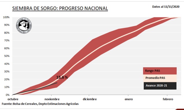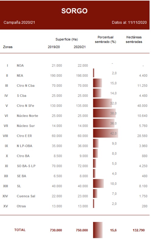 Durante las últimas semanas comenzó la incorporación de lotes de sorgo granífero en toda el área agrícola nacional. Esta nueva campaña 2020/21 marca una expansión de 100.000 Ha destinadas al cereal en comparación al ciclo previo. A la fecha el avance de siembra se ubica en 15,6 % de un área proyectada en 850.000 Ha., un 13,3 % superior al ciclo previo (Superficie campaña 2019/20: 750.000 Ha.). A la fecha ya se sembraron 133.000 Ha a lo largo del país, con los mayores avances en las provincias de Santa Fe y Entre Ríos.