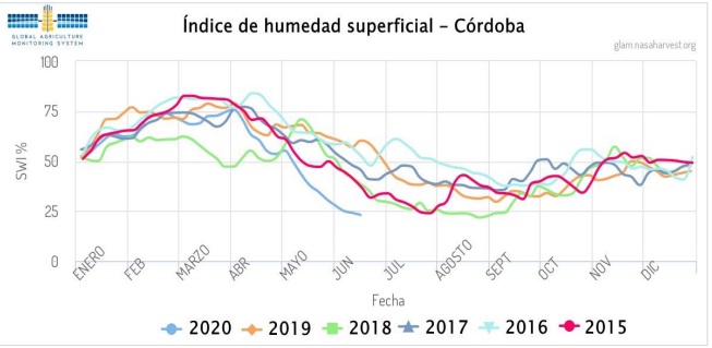 Como se ha mencionado en informes previos, la escasez de humedad en el estrato superficial en el norte y oeste del área agrícola, debido a la falta de lluvias que prevalece prácticamente desde fines de marzo, se ha extendido sobre buena parte de la ventana de siembra en estas regiones. Debido a ello, se estima que unas 150.000 Ha no podrán ser implantadas, la mayor parte de dicha superficie se encuentra en la provincia de Córdoba, que hoy en día presenta el menor índice de humedad superficial en comparación a las últimas cinco campañas.