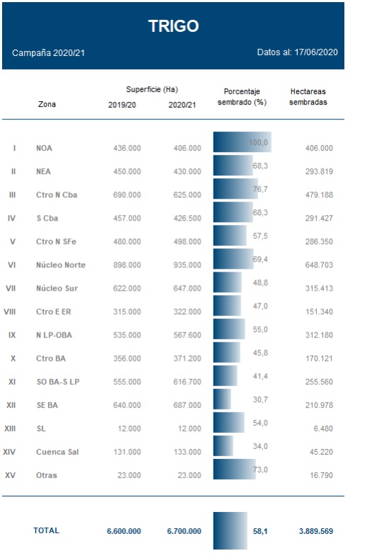 El clima seco durante gran parte de la ventana de siembra en amplios sectores del norte y oeste de la región agrícola obligan a los productores a resignar parte de la superficie inicialmente destinada al cereal. En paralelo, al sur del área agrícola se acentúa el traslado de superficie de cebada a trigo, compensando parcialmente la reducción de área registrada en la provincia de Córdoba y las regiones NOA y NEA. Esto se traduce en una caída neta de 100.000 Ha, retrayendo el área total nacional a 6,7 MHa, pero manteniendo una expansión interanual del 1,5 %. Sobre este total, el avance de siembra nacional cubrió el 58,1 %.