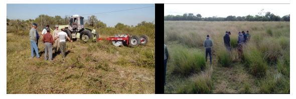 Otra práctica realizada es el mejoramiento del campo natural aplicando distintos disturbios en pastizales, control de renovales en forma mecánica y química. Con el objetivo de mejorar la disponibilidad de forrajes y ser eficientes en producir más kg de carne/ha/año. El Promotor Asesor Nicolás Matta, realizó una capacitación en la cual se analizó los métodos utilizados a fin de evaluar los resultados obtenidos por los productores. Luego se recorrió los potreros tratados y visitaron los campos de Stechina Rolando (quema, rastra y herbicida) y Benseñor Marcos, en el cual se puso en funcionamiento un tractor con pala frontal y rolo. Matta recomendó: 1) toconéo para controlar el rebrote de los renovales, 2) pasar la pala frontal a baja altura para evitar que queden muchas plantas en pie y 3) Lastrar el rolo para obtener un mejor tratamiento y control. Es a destacar el trabajo de los productores para optimizar el pastoreo, quienes realizan la subdivisión de potreros, en alguno de los casos con alambrados convencionales de 5 hilos, como red troncal y sus derivaciones con alambrados eléctricos. Observando así, que en sitios de difícil control de pajonales la mejor opción resultó avanzar con alambrados eléctricos con buena limpieza para proteger de quemas que se generan en la zona.