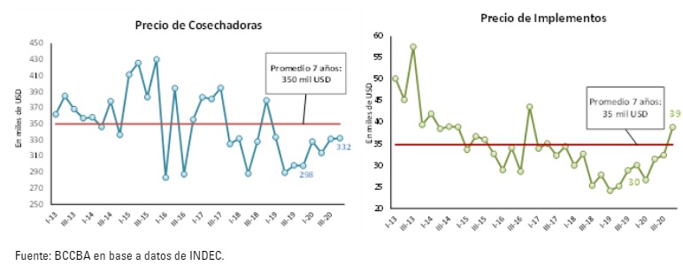 Esto último se puede analizar con más detalle en los dos gráficos a continuación. Los mismos muestran cómo a partir de 2018, tras la recaída del sector de maquinarias agrícolas, el precio en dólares comenzó a disminuir a causa de que los precios en pesos estaban prácticamente estables y la moneda local atravesaba una depreciación continua. Estos precios mínimos representaron un costo promedio de USD 298.000 por una cosechadora y USD 30.000 por un implemento hacia fines de 2019. Actualmente estos precios se ubican en USD 332.000 y USD 39.000 respectivamente.