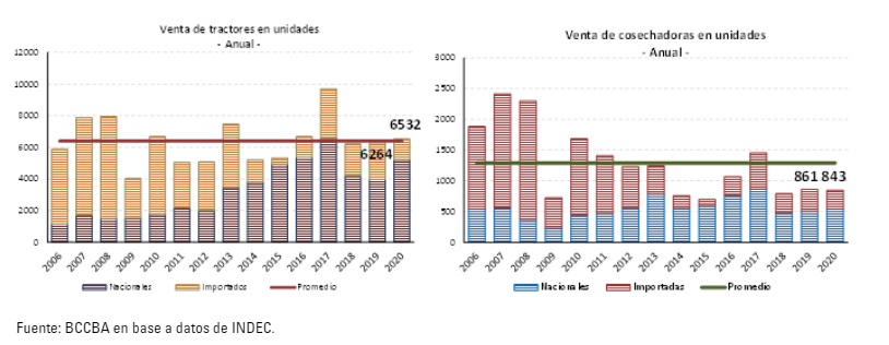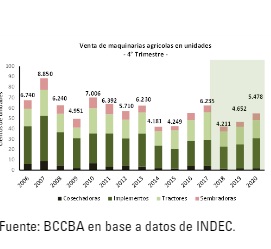 Respecto a la procedencia de las cosechadoras, tractores e implementos, se vio un incremento en la participación en las ventas de maquinaria nacional en detrimento de las importadas a comparación del cuarto trimestre de 2019, pasando de representar un 73% de las unidades comercializadas a un 92%. De estos tres, el rubro de las cosechadoras y tractores presentaron el mayor incremento en unidades nacionales vendidas, pasando de una representación del 53% en el cuarto trimestre de 2019 a una participación del 94% en el último trimestre de 2020.