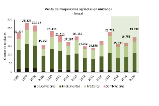 Analizando el acumulado para el año 2020, y sumando todos los rubros, las ventas de unidades de maquinaria agrícola creció un 18,7% respecto del año anterior. Acumulando 19.899 ventas, este año presenta el segundo mayor volumen vendido en los últimos siete años, y se mantiene por encima del promedio de los últimos diez años (18.517 unidades).