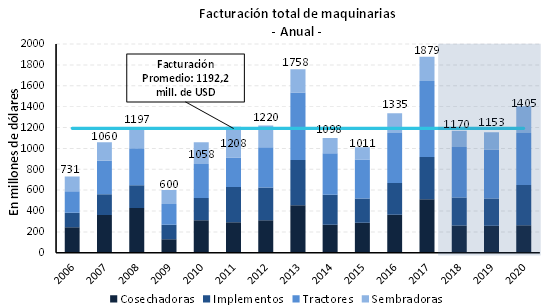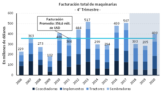 La venta de maquinaria agrícola incrementó 18% en el cuarto trimestre del año 2020 respecto al mismo periodo del año anterior, alcanzando las 5.478 unidades comercializadas. Para el acumulado anual, el volumen negociado de 19.899 unidades ubicó al 2020 como el segundo mejor año del sector de los últimos 7 años. Si bien la industria aun no alcanza los niveles de venta de los años 2007 o 2008, la facturación acumulada en 2020 es superior a la de aquellos años, y se ubica en el tercer mayor volumen de los últimos 15 años, con un monto de USD 1.405 millones.