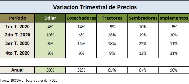 Si se compara la evolución de los precios de las maquinarias en pesos con el aumento del tipo de cambio oficial en el mismo período, puede observarse la recuperación que ha presentado la industria de maquinaria agrícola en el 2020. El incremento en los precios en moneda local fue mayor que la depreciación del peso, haciendo que el precio de las maquinarias en dólares comience a recuperarse. Durante el 2020, la depreciación del tipo de cambio fue del 30%, mientras que el rubro de maquinarias que registró el menor incremento de precios en pesos fue el de cosechadoras, con un 32%. Por otro lado, los implementos presentaron el mayor aumento de los precios en pesos, con una suba del 90%.