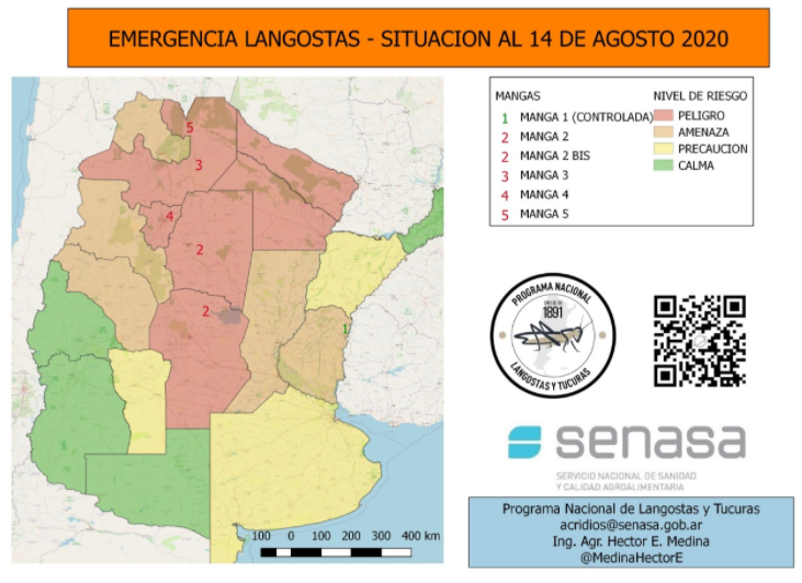 Córdoba 19 de agosto de 2020 – Funcionarios y técnicos del Servicio Nacional de Sanidad y Calidad Agroalimentaria (Senasa) y del Ministerio de Agricultura y Ganadería de Córdoba intensificaron las acciones de monitoreo y control en la zona norte de la provincia, ante la detección de mangas de langosta. El ingreso de la plaga a la provincia se dio durante el fin de semana, proveniente de Santiago del Estero.