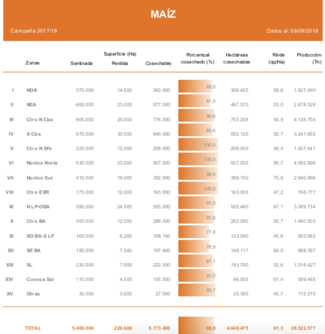 Desde nuestro informe previo, la cosecha de cuadros de maíz con destino grano comercial continuó en gran parte del área agrícola nacional. La recolección avanza sobre los últimos lotes tardíos en el centro del país, mientras que aún restan por cosechar una buena parte de los cuadros de segunda ocupación. En las regiones del norte, la baja en la humedad de los granos y las buenas condiciones del tiempo permitieron a los productores avanzar a buen ritmo sobre los lotes sembrados en diciembre. Los rindes relevados en las diferentes zonas PAS se ubican por debajo de los promedios de las últimas campañas producto del déficit hídrico sufrido durante la floración. De esta manera, el rendimiento medio nacional se ubicó en 61,3 qq/Ha, luego de recolectarse cerca de 4,7 MHa a lo largo del país.