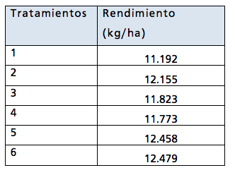 La experiencia mostró resultados muy interesantes. La variancia fue significativa a un nivel del 20 %, con un coeficiente de variación del 6 %. Si se analizan las medias considerando válido ese valor, los tratamientos se ordenan de la siguiente manera: