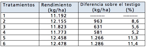 Como se aprecia, todos los tratamientos que llevaron algún adicional de fertilidad, rindieron más que el testigo y no se diferenciaron entre sí. Igualmente el mejor resultado lo tendrían los tratamientos 6 y 5.
