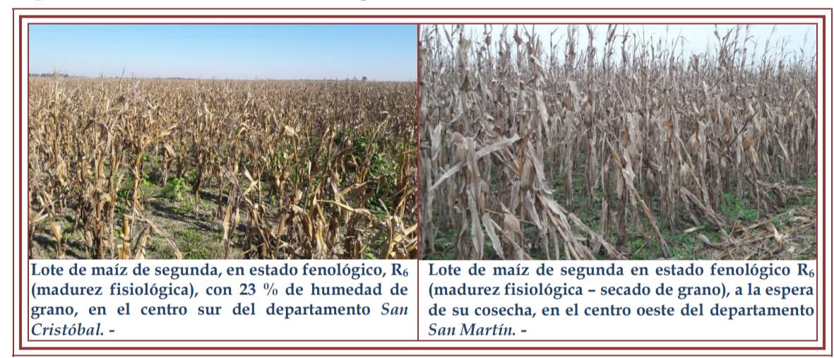Siendo esta característica la que se mantuvo desde el comienzo de cosecha, por lo que se sumaron gastos de secada, para el acondicionamiento del cereal. Aunque, en general, los acopios tuvieron mayor tolerancia en este ítem con respecto al maíz de primera. En la semana se obtuvieron los siguientes rendimientos promedios mínimos que fluctuaron entre 18 – 25 – 30 qq/ha y rendimientos promedios máximos entre 50 – 65 qq/ha, con máximos en lotes puntuales de 70 qq/ha. Estos resultados continuaron manifestándose en los diferentes escenarios en los que se desarrolló el cultivo y sus consecuencias. Se observó, en toda el área, el siguiente estado fenológico: R “estados reproductivos” R6 (madurez fisiológica).