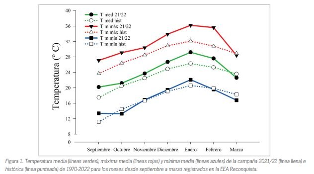 Con respecto a las condiciones ambientales, los registros de temperatura que se presentaron en la última campaña se pueden visualizar en la Figura 1. En la misma se puede observar que tanto las temperaturas medias máximas, como las medias, estuvieron por encima de los promedios históricos durante todos los meses de la campaña, con excepción de marzo. Los meses de diciembre 2021 y enero 2022 fueron los más cálidos registrados en la EEA Reconquista, alcanzando las temperaturas más altas desde los registros iniciados en 1960.