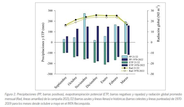 Por otro lado, los registros de precipitaciones, evapotranspiración potencial y radiación solar recibida se representan en la Figura 2. Al analizar el registro de precipitaciones durante la campaña, se observa que solamente los meses de noviembre, febrero y marzo registraron precipitaciones superiores o cercanas al promedio, estando los demás meses por debajo del promedio histórico. Además, la sumatoria de precipitaciones de diciembre y enero fue de 77,4 mm con 223,5 mm menos que el promedio histórico para estos meses. Siendo de ahora en más el conjunto diciembre y enero más seco y cálido de la historia. Al contrario de lo registrado para las precipitaciones, tanto la evapotranspiración potencial como la radiación solar estuvieron por encima de los promedios históricos en todos los meses, con excepción del mes de marzo.