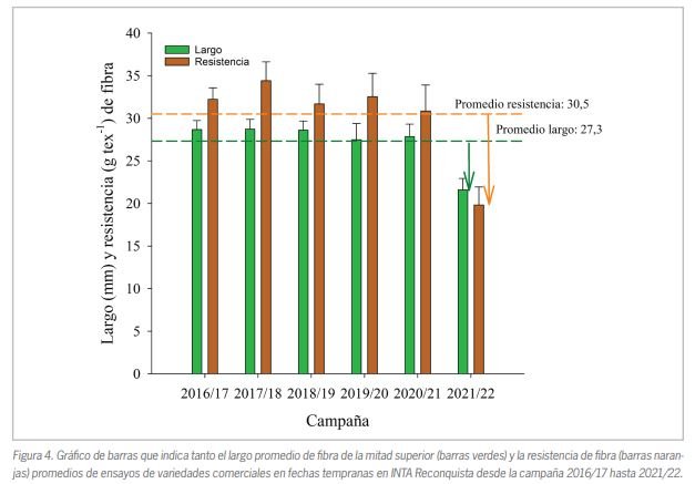 En lo que respecta a la calidad de fibra, en la Figura 4 se puede observar dos de los parámetros más importantes de las variables de calidad tecnológica de fibra, largo y resistencia. En la misma se puede interpretar cómo en esta campaña no solo se registró una pérdida importante de rendimiento, sino que también, la fibra obtenida mostró menores valores en lo que respecta a parámetros de calidad de fibra. Estos niveles de calidad tecnológica de fibra tendrán efectos negativos en toda la cadena de producción, debido a que se pueden producir pérdidas de eficiencia tanto en el proceso de desmote como en el hilado, tejeduría, teñido y confección de prendas. En este sentido, calidades pobres de fibra hacen necesaria mezclas de fardos provenientes de diferentes lotes y/o campañas, lo que provocan pérdidas de eficiencia en todos los procesos de industrialización del cultivo.