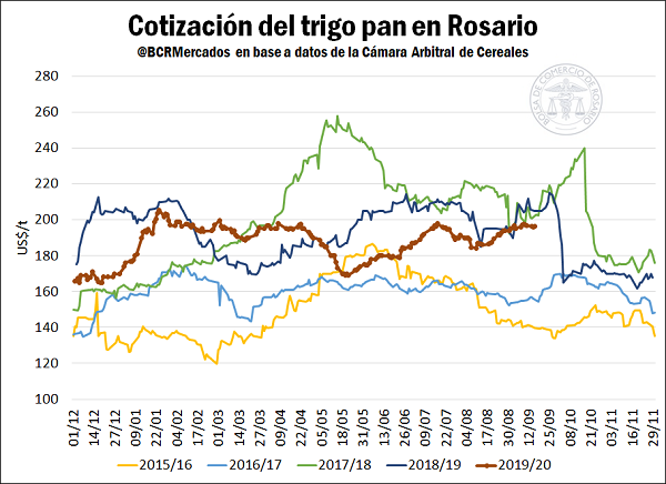 En el último tramo de lo que va de la campaña de trigo 2019/20, las cotizaciones del cereal presentaron una enorme mejora. Desde el bache que se presentó a mediados de año, con un mínimo de US$ 169,17/t el 22 de mayo, hasta los actuales US$ 197/t, la suba alcanza un 16,5%. Tomando lo que va del segundo semestre de la campaña comercial, es decir, desde el 1ro de junio, el incremento del 12,4% lo convierte en el mejor segundo semestre de los últimos 5 ciclos. En 3 de las últimas campañas las cotizaciones se redujeron durante este período y en sólo un caso se mantuvo el valor. No obstante, las cotizaciones actuales se mantienen por debajo los ciclos 2017/18 y 2018/19.