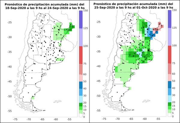 Si bien dos semanas atrás se presentó un alivio en forma de lluvias durante 3 días consecutivos que regó buena parte de los cultivos de la zona núcleo, dichas precipitaciones precisan un refuerzo para afianzar las mejoras y evitar nuevas mermas en las estimaciones productivas del país. Según el Sistema Meteorológico Nacional en la próxima semana es muy baja la probabilidad de lluvias en la región núcleo y en los alrededores de Rosario. Si bien dicho pronóstico mejora durante el período del 25 de septiembre hasta el 1 de octubre, debe tenerse en cuenta que el mayor volumen de precipitaciones se daría en el NEA y que las lluvias pronosticadas para la región centro estarían entre los 5 y 30 mm. Se deberá esperar para saber cuál es el devenir de la producción de la cosecha fina de la zona, teniendo en cuenta además que octubre es el período crítico para definir su rinde.
