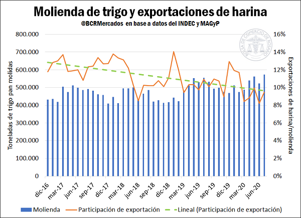 La situación productiva de trigo es mirada con gran atención por el fuerte impulso productivo que mostró el cereal durante los últimos cuatro años en Argentina. Gracias a ello se observó un destacable aumento de las exportaciones de granos, a la vez que subió el uso industrial del cereal aunque a una tasa menor. Al mismo tiempo, el aumento en el consumo interno de harina de trigo ha redundado en que la participación de las exportaciones en el volumen de molienda de trigo haya caído en términos relativos, según datos del Ministerio de Agricultura Ganadería y Pesca (MAGyP) y del Instituto Nacional de Estadística y Censos (INDEC). En efecto, tal como muestra el siguiente gráfico, la tendencia de la participación de las exportaciones sobre el tonelaje molido evidencia un retroceso en tanto ha crecido la participación del consumo interno en las últimas campañas.