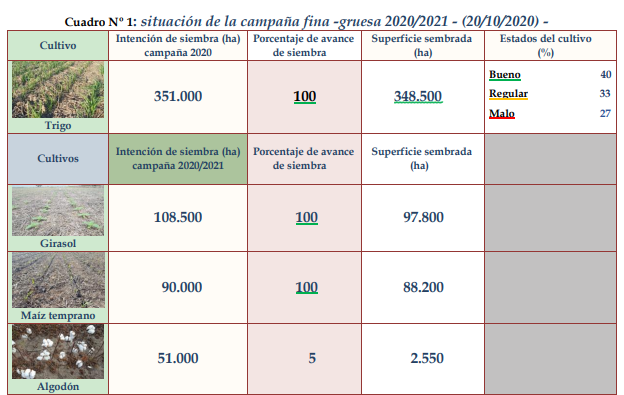 En el noreste del SEA, norte y sur del departamento General Obligado, la siembra de algodón incorporó algunos lotes más, al igual que el cultivo de sorgo granífero. Las tareas efectuadas en la semana fueron: a) monitoreo – seguimiento de trigo, girasol y maíz temprano, b) siembra de arroz, c) siembra de algodón, d) siembra de sorgo granífero, e) roturación y acondicionamiento de algunos lotes para futura siembra, f) colocación y monitoreo de trampas para el picudo algodonero. Para el período comprendido entre el miércoles 21 al martes 27 de octubre de 2020, los pronósticos prevén desde su inicio, condiciones de inestabilidad climática, temperaturas diarias medias a levemente altas, con nubosidad parcial a total, altas probabilidades de precipitaciones de variadas intensidades y homogeneidad en sus montos, que alternarían con algún período soleado, situación que se manifestaría con mayor impacto en el centro y sur del área de estudio. Dichos escenarios, con el transcurso de los días se ubicarían en el sector norte provincial. A partir del lunes 26, volverían las condiciones de estabilidad, buen tiempo y jornadas soleados. Las temperaturas medias diarias fluctuarían entre mínimas de 11 a 24 ºC y máximas de 18 a 37 ºC.