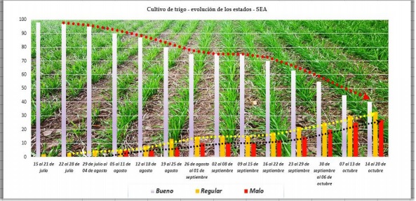 El restante 27 %, se halló en estado malo, con inconvenientes en los stands de plantas por unidad de superficie, coloración pálida, con sectores amarillentos en su área foliar, ante la ausencia de precipitaciones, poco desarrollo de estructura de planta, no uniformes. Ubicándose geográfica y particularmente en los extremos suroeste y noroeste del SEA y sectores con posiciones topográficas medias a bajas o ciertas limitantes en la aptitud de los suelos