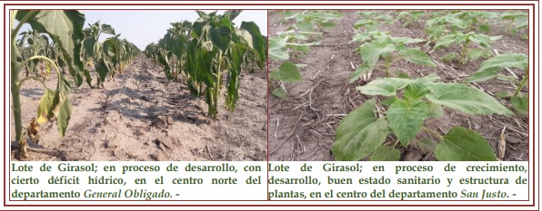 En general, los cultivares de girasol presentaron buen estado, pero algunos lotes puntuales evidenciaron la carencia de agua. Las precipitaciones ocurridas al final del período mejorarían el estado general, pero no serían suficientes para el buen inicio de los estadios reproductivos, dado que la demanda de agua iría en aumento, sobre todo al comienzo de la floración. Además, se encontraron algunos predios con plantas de menor porte, menos desarrolladas y de irregular estructura, comparadas con las de la campaña pasada. Hasta el momento se observó muy buena sanidad, sin inconvenientes. Se detectaron los siguientes estados fenológicos; V “estados vegetativos”, V3 (3º par de hojas verdaderas), V4 (4º par de hojas verdaderas), V5 (5º par de hojas verdaderas), V6 (6º par de hojas verdaderas), V7 (7º par de hojas verdaderas), V8 (8º par de hojas verdaderas), V9 (9º par de hojas verdaderas) y en lotes puntuales, más avanzados, en comienzo de R “estados reproductivos”.