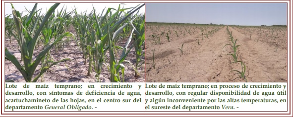 Ante las condiciones ambientales registradas, la falta o ausencia de precipitaciones, los aumentos de los registros térmicos diarios, se observaron impactos en los cultivares de maíz temprano, tales como, acartuchamiento de las hojas y retraso en el desarrollo en altura de las plantas. Hasta la fecha presentaron un buen stand por unidad de superficie y sin inconvenientes sanitarios. Se observaron los siguientes estados fenológicos: V “estados vegetativos”, V3 (3º hoja desarrollada), V4 (4º hoja desarrollada), V5 (5º hoja desarrollada), V6 (6º hoja desarrollada) y en lotes más avanzados, V7 (7º hoja desarrollada).
