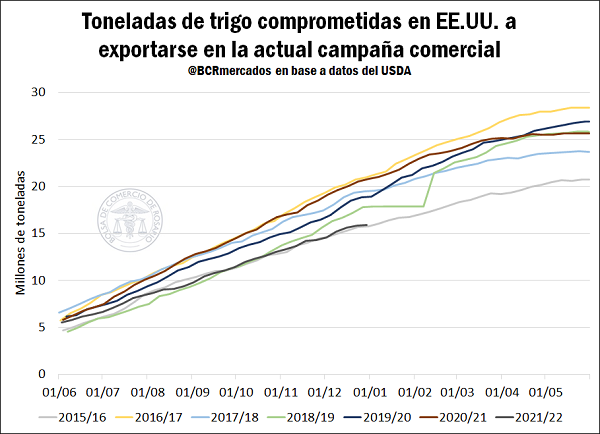 Por otra parte, según los datos de la agencia marítima NABSA S.A. los despachos de grano en diciembre totalizaron 1,9 Mt, superando en un 134% el registro de diciembre del 2020, en parte debido a los conflictos gremiales que afectaron los embarques en dicho mes y en parte gracias a la recuperación productiva de la campaña en curso. Así, si se compara lo sucedido en el mes pasado ciclos anteriores, puede afirmarse que se encontró por encima de los períodos 2016/17 y 2017/18, mientras que se mantuvo por debajo de los 2 siguientes.