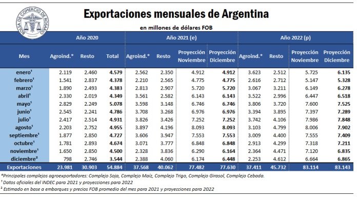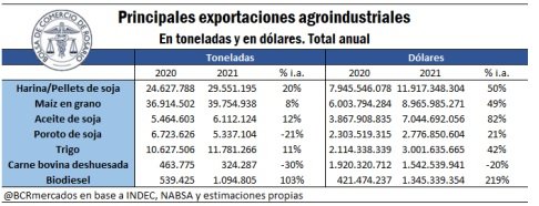 Con datos preliminares del diciembre pasado, las exportaciones agroindustriales totalizaron US$ 37.578 millones en 2021. De esta manera, consolidan una suba superior al 56% respecto a los US$ 23.981 millones del año 2020.
