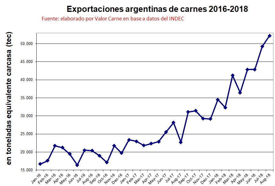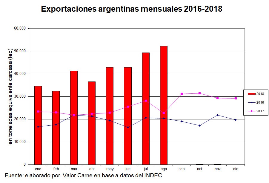 En la variación con agosto de 2017, que fue de nada menos que 20 mil toneladas peso embarque, China contribuyó con 13 mil (triplicó sus compras con respecto a ese mes); Rusia, con 4.200 t; Chile, con 1.700 t; y la UE, con 700 t. En estos dos últimos mercados todo el aumento recayó en el rubro de enfriado.