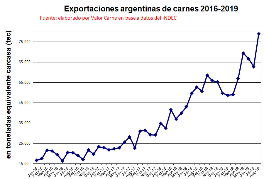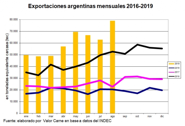 El viernes, el INDEC dio a conocer las cifras de las exportaciones argentinas de carne vacuna de agosto. Suman 78.945 toneladas equivalente carcasa (tec), 26% más que en julio y 50% más en la comparación interanual.