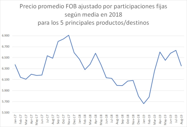 Si hacemos abstracción de las variaciones de la participación de cada mercado, el promedio ponderado de agosto fue 4% menor al de julio pero 6% mayor al de agosto de 2018.