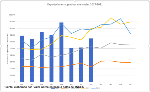 Las exportaciones argentinas totalizaron 65 mil toneladas equivalente carcasa (tec) en agosto, 26% más que en julio y 17% menos en forma interanual.