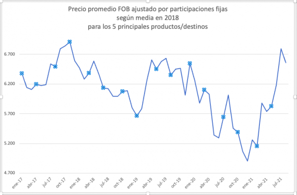 El precio medio fue de USD5.200 por tonelada peso embarque FOB, 3% menor al de julio y 13% mayor interanual.