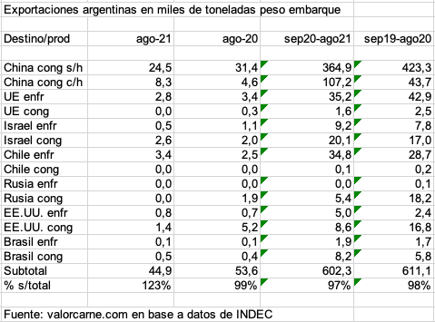 Con respecto a agosto anterior, las principales variaciones se dieron con China, que redujo en 4.500 t el congelado sin hueso, aunque casi lo compensó con aumento de 4.100 t de con hueso; la UE con menos 2 mil t de enfriado y 500 t de congelado; Israel -1.100 t de enfriado casi compensado con 800 t de congelado; Rusia -2.500 t; EE.UU. -1.700 t; y Brasil -200 t. El único destino que aumentó en forma interanual fue Chile con sólo 140 t.