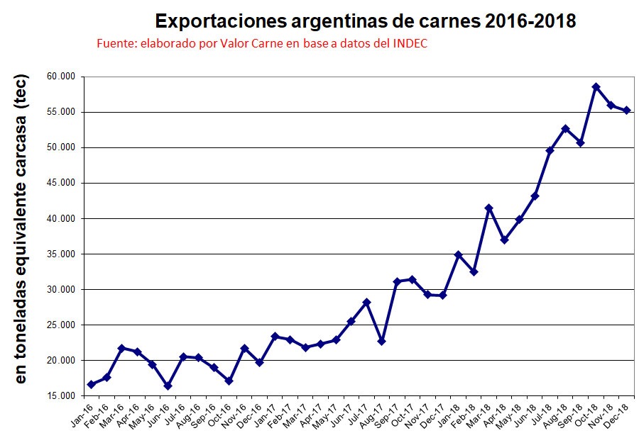 Las exportaciones argentinas finalizaron 2018 con el empuje que venía caracterizando los últimos meses. En diciembre, se embarcaron 55 mil toneladas equivalente carcasa (tec), repitiendo los altos niveles de octubre y noviembre.