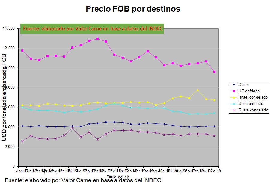 El precio promedio FOB de la carne fue de USD 5.300 por tonelada peso embarque, 15% menos que en 2017.