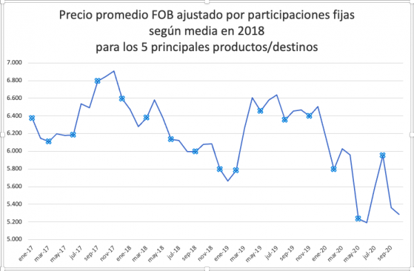 El valor FOB promedio de octubre fue de USD4.040, un 4% menos en un mes y un sustancial 27% por debajo de octubre de 2019.