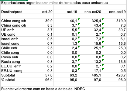 Mientras se enviaron 6.000 t peso embarque (unas 9 mil tec) más a China, todo ese incremento fue neutralizado por bajas en todos los demás destinos importantes, a saber: Israel, 2 mil; Rusia, 1.700; la UE, mil; y Chile y EE.UU., 700 t cada uno.