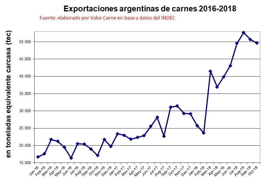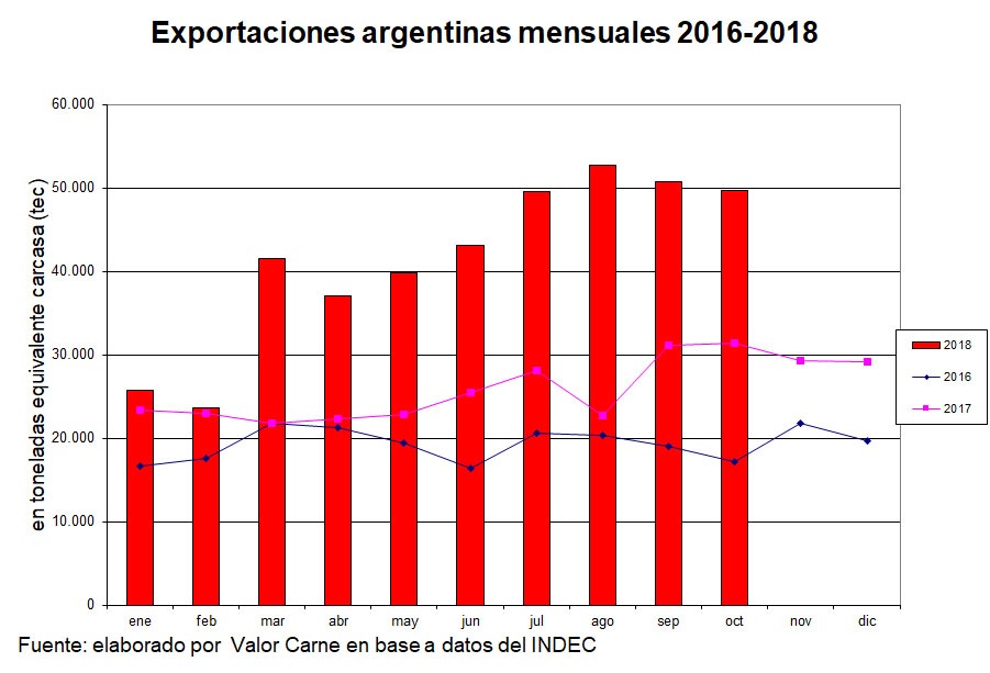 Las exportaciones argentinas totalizaron 50 mil toneladas equivalente carcasa (tec) en octubre, manteniéndose en torno a esa cifra durante los últimos cuatro meses. En tanto, el número de septiembre fue corregido a 51 mil tec desde las 48 mil informadas hace un mes.