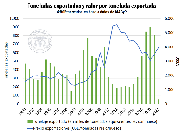 Aún con las restricciones a la exportación que se implementaron a lo largo del 2021, el año pasado acabó como el segundo mayor registro histórico en términos de ingresos de divisas por exportaciones. Esto se debió principalmente al incremento en las cotizaciones internacional de las proteínas animales, logrando compensar el efecto de dichas trabas a la exportación. En este sentido, a pesar de que la caída en los volúmenes exportados rondó el 11% entre 2021 y 2020, acabando así con envíos totales equivalentes 803.385 toneladas (res con hueso equivalente), los ingresos FOB anuales se encontraron apenas por encima de los del 2020 (+2,2%), implicando un total de US$ 2.786 millones.