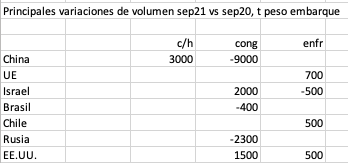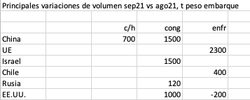 Al comparar con septiembre anterior sorprenden aumentos superiores a 40% hacia China, EE.UU. y Brasil y una más que duplicación para Rusia, aunque aquí ha de pesar un cambio de mix y, por el bajo volumen en el mes pasado, su concentración en productos de mayor precio.