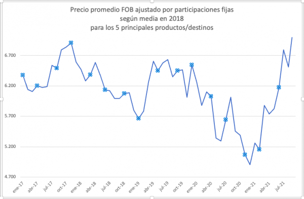 Septiembre marcó el mayor valor FOB en cinco años. Se trata de la serie de precios ponderados con base fija para cada destino, de manera de no verlos afectados por cambios en el mix de mercados.