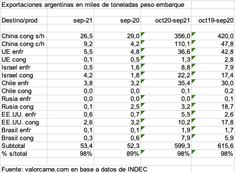 En la caída con respecto a septiembre del año pasado, el factor determinante fue China con congelado sin hueso, ya que con hueso hay un aumento importante al igual que a otros destinos, excepto Rusia.