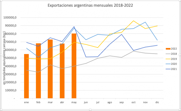 Las exportaciones argentinas totalizaron 80 mil toneladas equivalente carcasa (tec) en mayo, 18% más que en abril pero 10% menos en un año.
