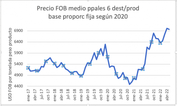 El precio de los seis principales productos/destinos, ponderado en función de la participación de cada mercado en 2020, bajó apenas 1% en mayo con respecto a abril, que había sido el valor más alto de los últimos cinco años.