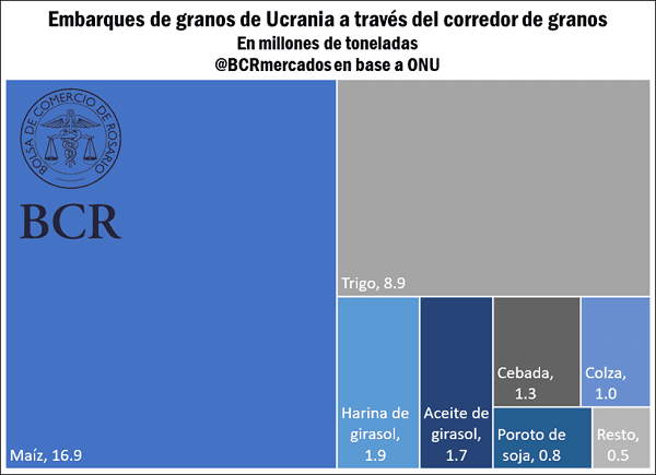 Con el corredor de granos seguro en funcionamiento, en los últimos 365 días se exportaron más de 32 millones de toneladas de granos desde los puertos ucranianos, de los cuales la mitad (51%) corresponde a maíz y 27% a trigo. Naturalmente, el primer y principal impacto en precios internacionales se debe buscar en estos dos cultivos.